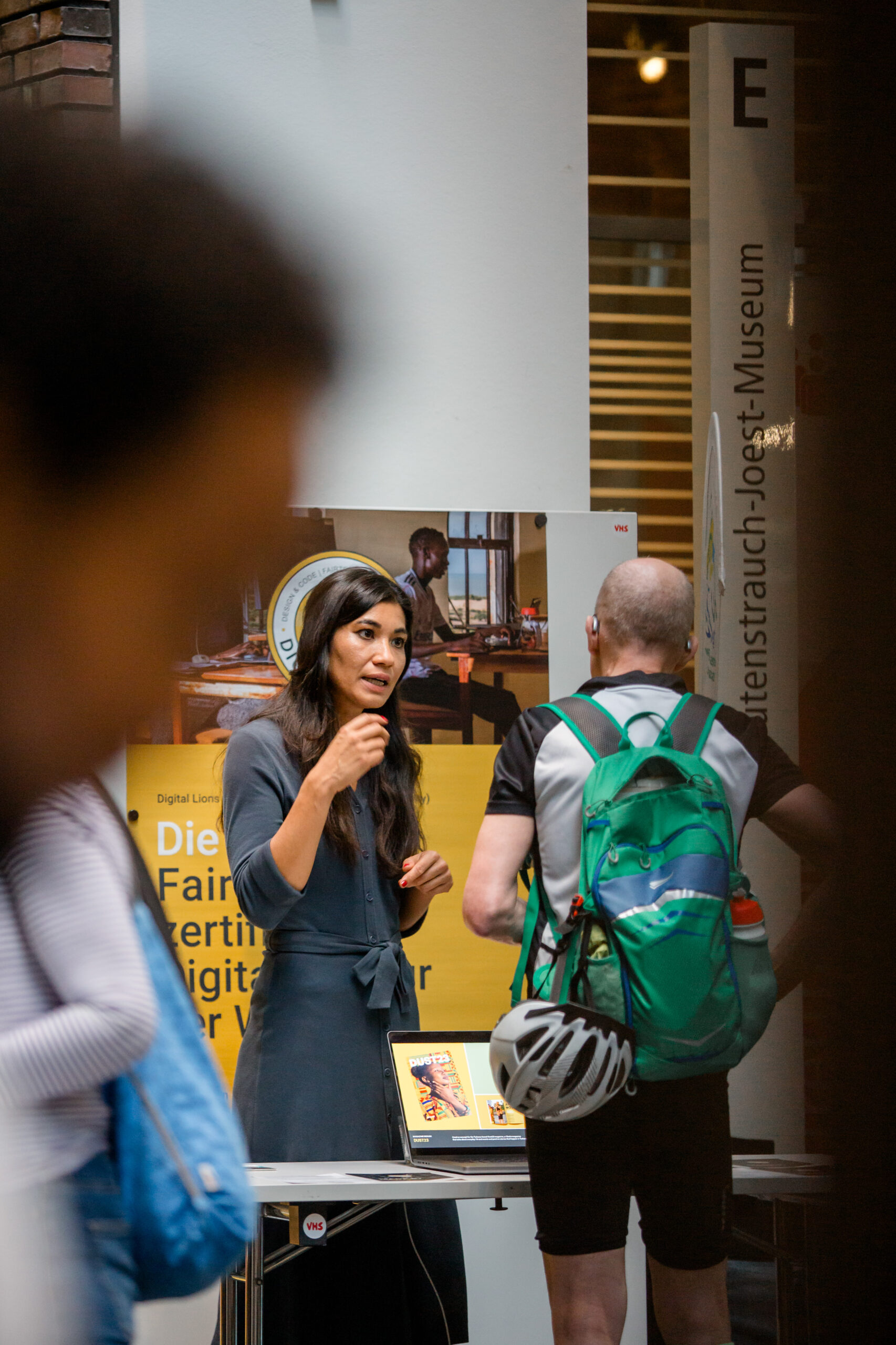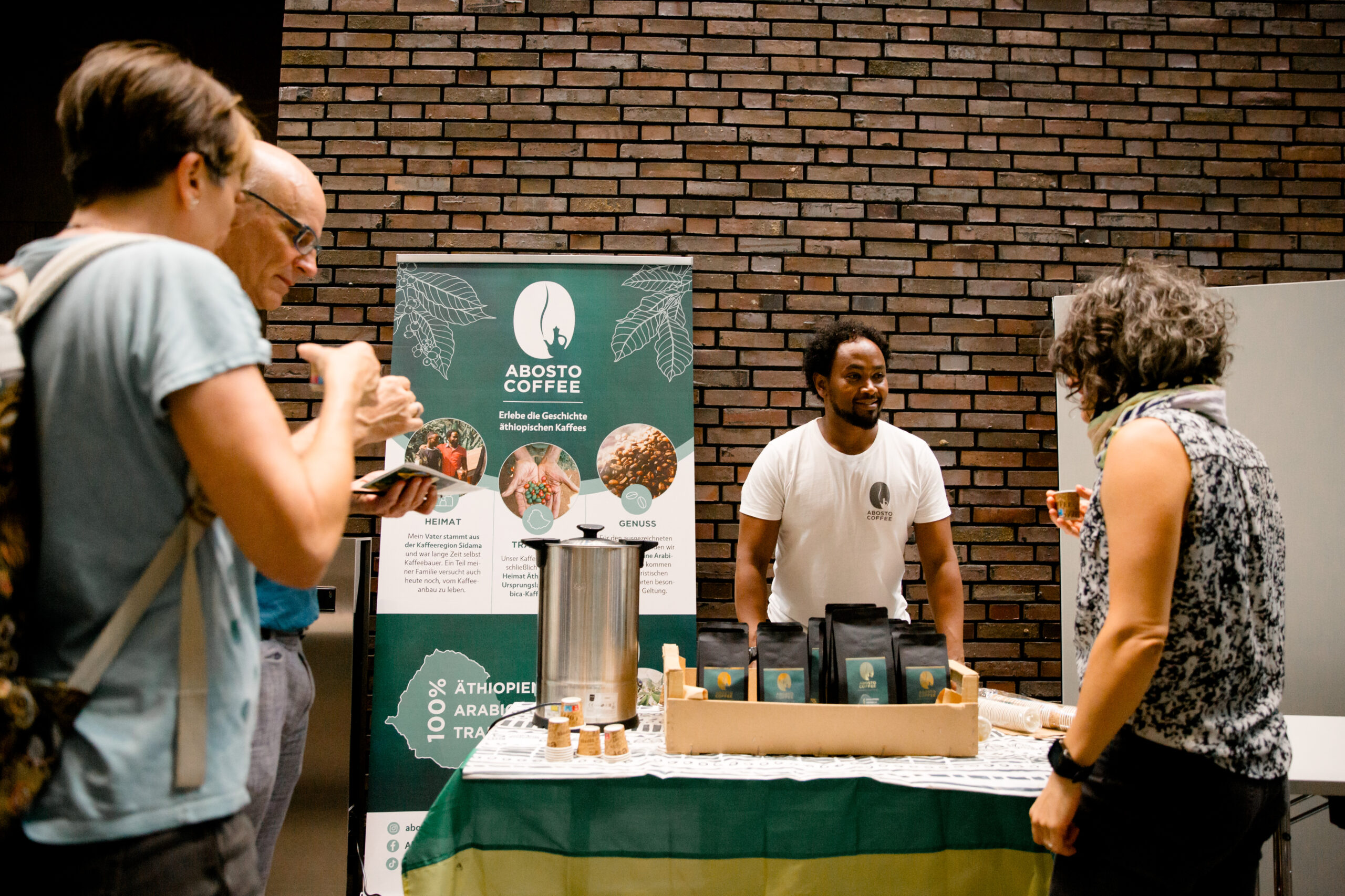 Die Welt des Fairen Handels wurde für die Besucher*innen erlebbar gemacht, ob bei einer äthiopischen Kaffeezeremonie von Abosto Coffee im Museumshof, Jeans Upcycling vom Iglu oder dem veganen Catering von Publik Kitchen. Außerdem konnten Besucher*innen unter Anleitung des Weltladens Köln in Kooperation mit Fairtrade Schools ihren eigenen CO2-Fußabdruck ausrechnen sowie auch das alternative Konzept des CO2-Handabdrucks kennenlernen.